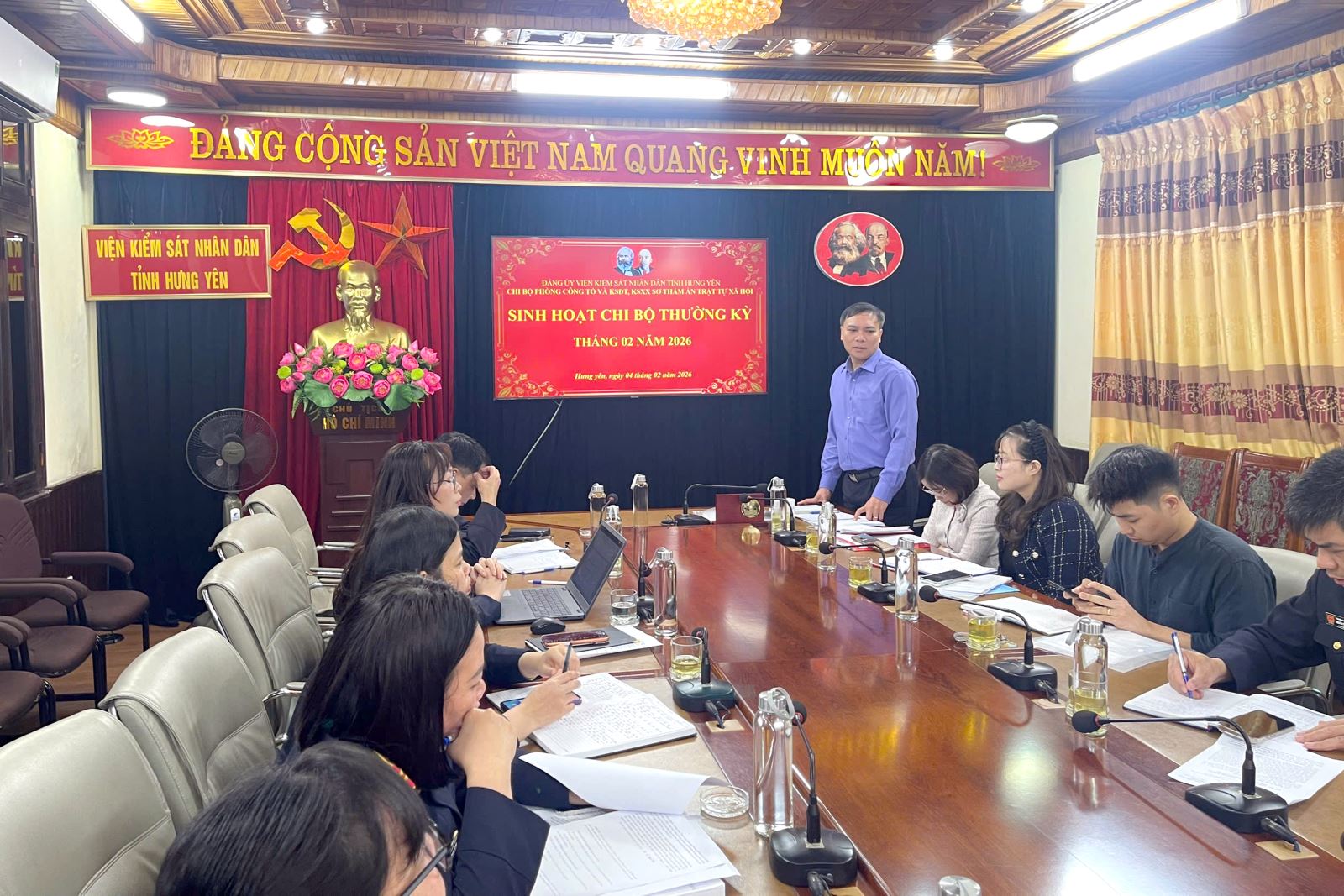 Tại buổi sinh hoạt, đồng chí Nguyễn Nguyên Hưng - Bí thư chi bộ Phòng 2 đã báo cáo tình hình hoạt động của Chi bộ tháng 01/2026 và phương hướng, nhiệm vụ trọng tâm trong tháng 02/2026. Điểm nhấn mạnh của buổi sinh hoạt là các đồng chí đảng viên tự kiểm điểm, đánh giá những kết quả đạt được, hạn chế, khó khăn vướng mắc trong việc thực hiện nhiệm vụ trọng tâm được đề ra để thực hiện trong tháng 01/2026 là: Ứng dụng công nghệ thông tin thực hiện chuyển đổi số và việc lãnh đạo thực hiện chỉ tiêu nghiệp vụ. Chi bộ và các đồng chí đảng viên đã thẳng thắn đánh giá những hạn chế, tồn tại như: Do khối lượng công việc cần giải quyết nhiều, việc sắp xếp công việc chưa khoa học nên tỷ lệ nhập phần mềm quản lý án hình sự còn thấp và một số chỉ tiêu nghiệp vụ còn chưa cao. Từ những hạn chế này, Chi bộ đã thảo luận, chỉ ra nguyên nhân và đề ra các giải pháp để khắc phục trong tháng 02/2026.