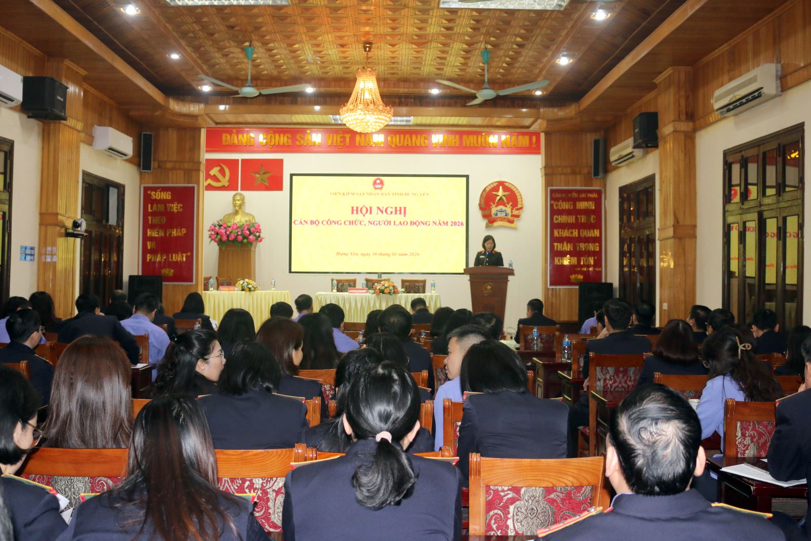Cùng ngày, VKSND tỉnh Hưng Yên đã tổ chức Hội nghị cán bộ, công chức năm 2026 để tổng kết hoạt động công tác năm 2025 và triển khai phương hướng, nhiệm vụ công tác năm 2026 với sự tham dự của các đồng chí lãnh đạo cùng toàn thể cán bộ, công chức, người lao động Viện kiểm sát nhân dân tỉnh Hưng Yên.