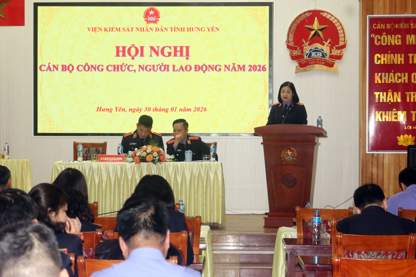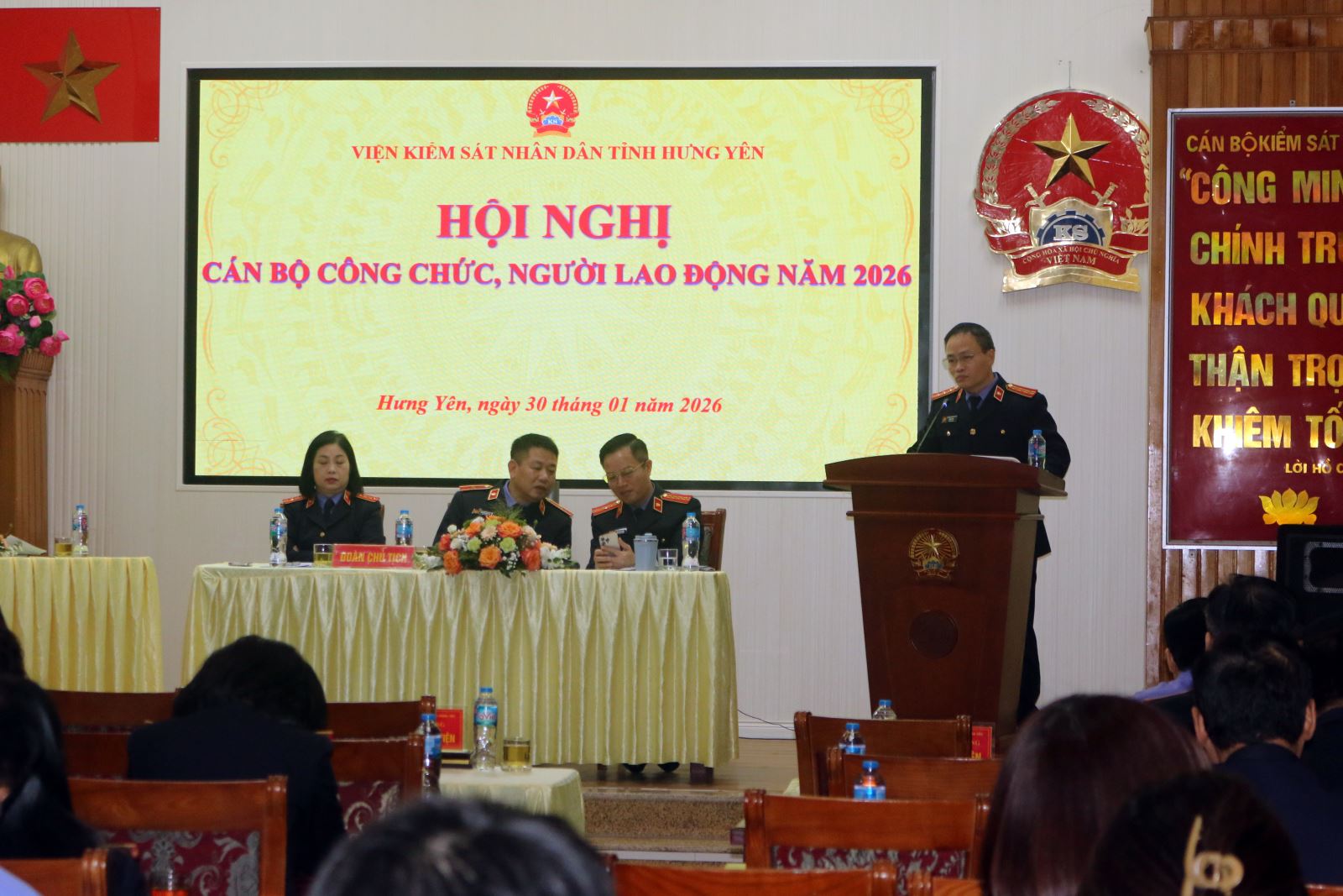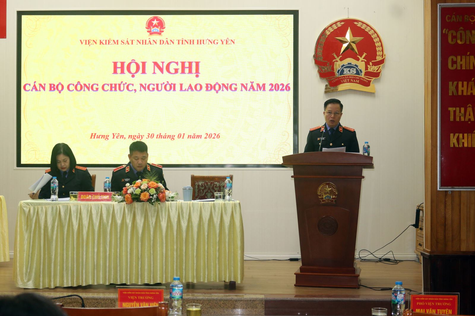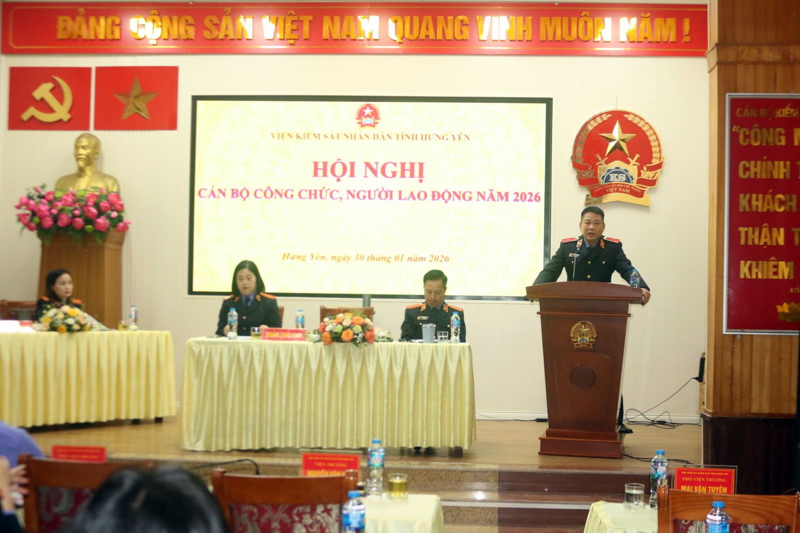 Bế mạc Hội nghị, đồng chí Mai Văn Tuyên - Phó Viện trưởng Viện kiểm sát nhân dân tỉnh đã phát biểu tiếp thu ý kiến chỉ đạo của đồng chí Viện trưởng Viện kiểm sát nhân dân tỉnh và các ý kiến, kiến nghị của cán bộ, công chức, người lao động bổ sung vào các báo cáo, phương hướng, nhiệm vụ công tác năm 2026 để triển khai, quán triệt thực hiện, góp phần cùng toàn ngành Kiểm sát Hưng Yên hoàn thành xuất sắc nhiệm vụ năm 2026.