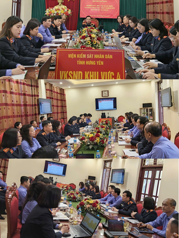 Ngày 07/02/2026, Đảng ủy Viện KSND tỉnh Hưng Yên tổ chức Hội nghị trực tuyến học tập, quán triệt và triển khai thực hiện Nghị quyết Đại hội đại biểu toàn quốc lần thứ XIV của Đảng tại 9 điểm cầu ở hai cấp, với tổng số 385 công chức, đảng viên và người lao động tham dự. Điểm cầu Viện KSND tỉnh tại hội trường Viện KSND tỉnh gồm các đồng chí Lãnh đạo Viện, toàn thể đảng viên, công chức và người lao động. Điểm cầu Viện KSND khu vực tại phòng họp trực tuyến của các đơn vị gồm toàn thể đảng viên, công chức và người lao động. Hội nghị diễn ra nghiêm túc, bảo đảm đầy đủ nội dung, yêu cầu đề ra.