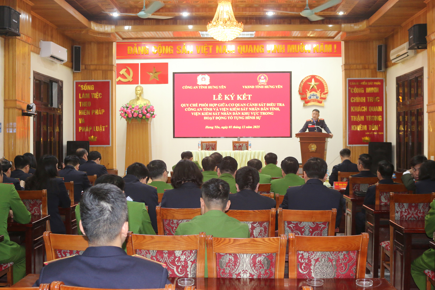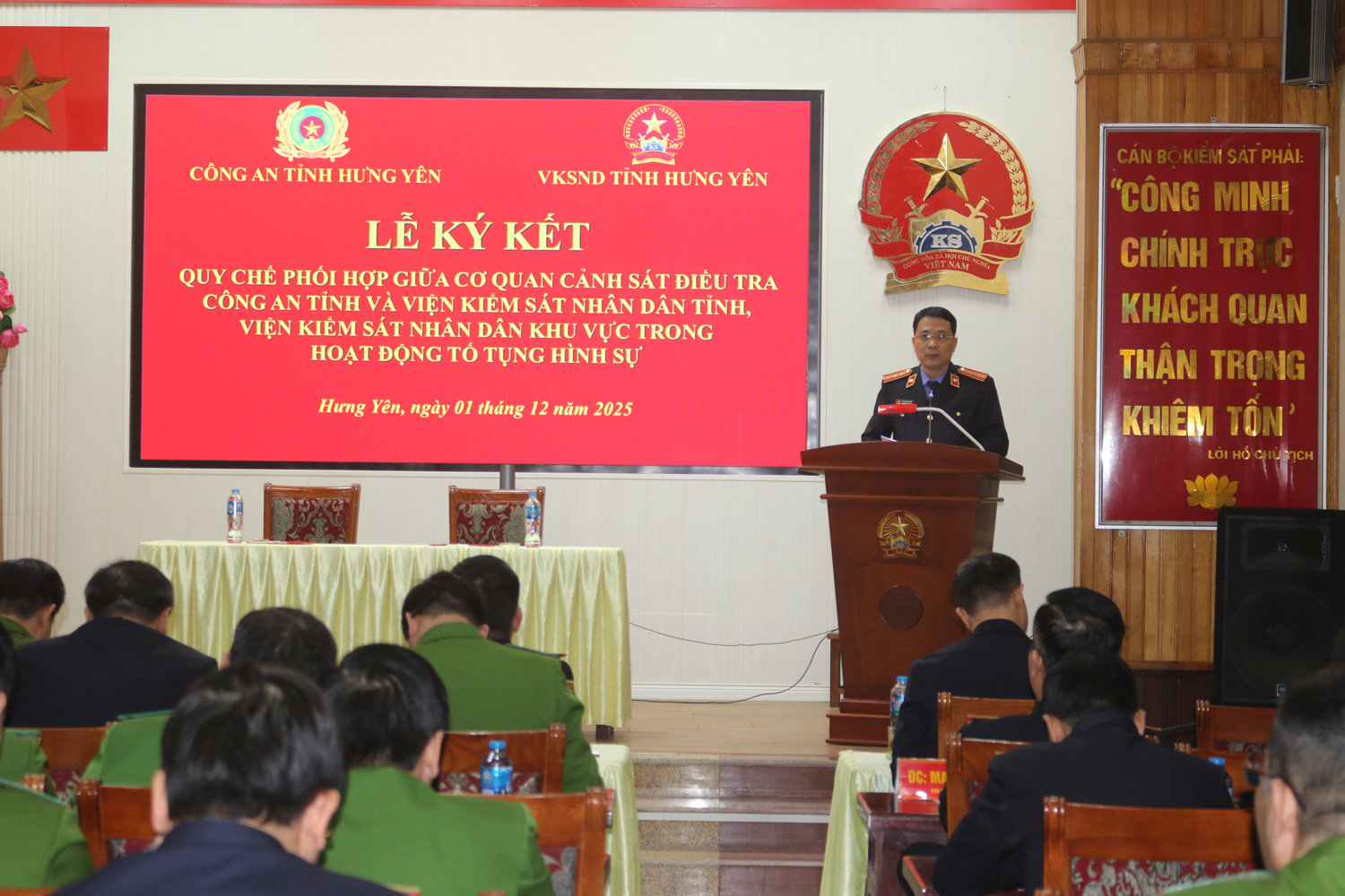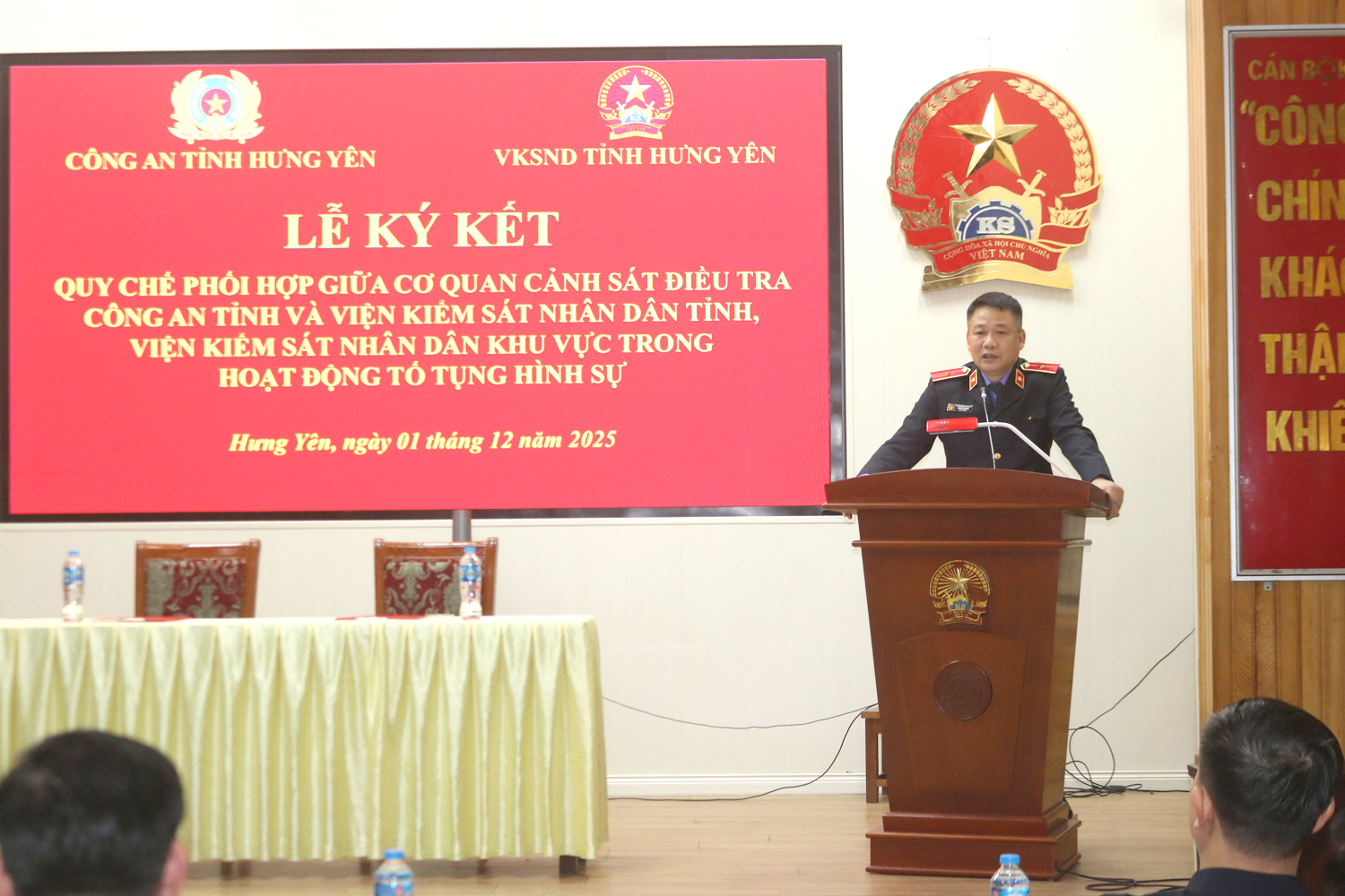 Phát biểu khai mạc, đồng chí Nguyễn Văn Viện - Viện trưởng VKSND tỉnh Hưng Yên nhấn mạnh việc ký kết quy chế phối hợp diễn ra trong bối cảnh hệ thống các cơ quan tư pháp của tỉnh vừa bước vào một giai đoạn chuyển mình mạnh mẽ, thực hiện quyết liệt chủ trương tinh gọn bộ máy theo tinh thần Nghị quyết 18 của Bộ Chính trị, đòi hỏi công tác phối hợp giữa Cơ quan điều tra và Viện kiểm sát hai cấp ngày càng phải chặt chẽ, hiệu quả hơn. Việc xây dựng và ký kết quy chế phối hợp sẽ xác định rõ trách nhiệm, cơ chế trao đổi thông tin, phương thức phối hợp giữa các đơn vị theo mô hình mới; tạo nền tảng pháp lý đồng bộ giúp hai ngành làm việc nhịp nhàng, thống nhất, kịp thời tháo gỡ khó khăn, vướng mắc trong từng vụ án, vụ việc, thực hiện tốt nhiệm vụ đấu tranh phòng, chống vi phạm, tội phạm, bảo đảm xử lý đúng người, đúng tội, đúng pháp luật, nhất là trong bối cảnh xuất hiện nhiều loại tội phạm mới, tính chất ngày càng phức tạp hiện nay.